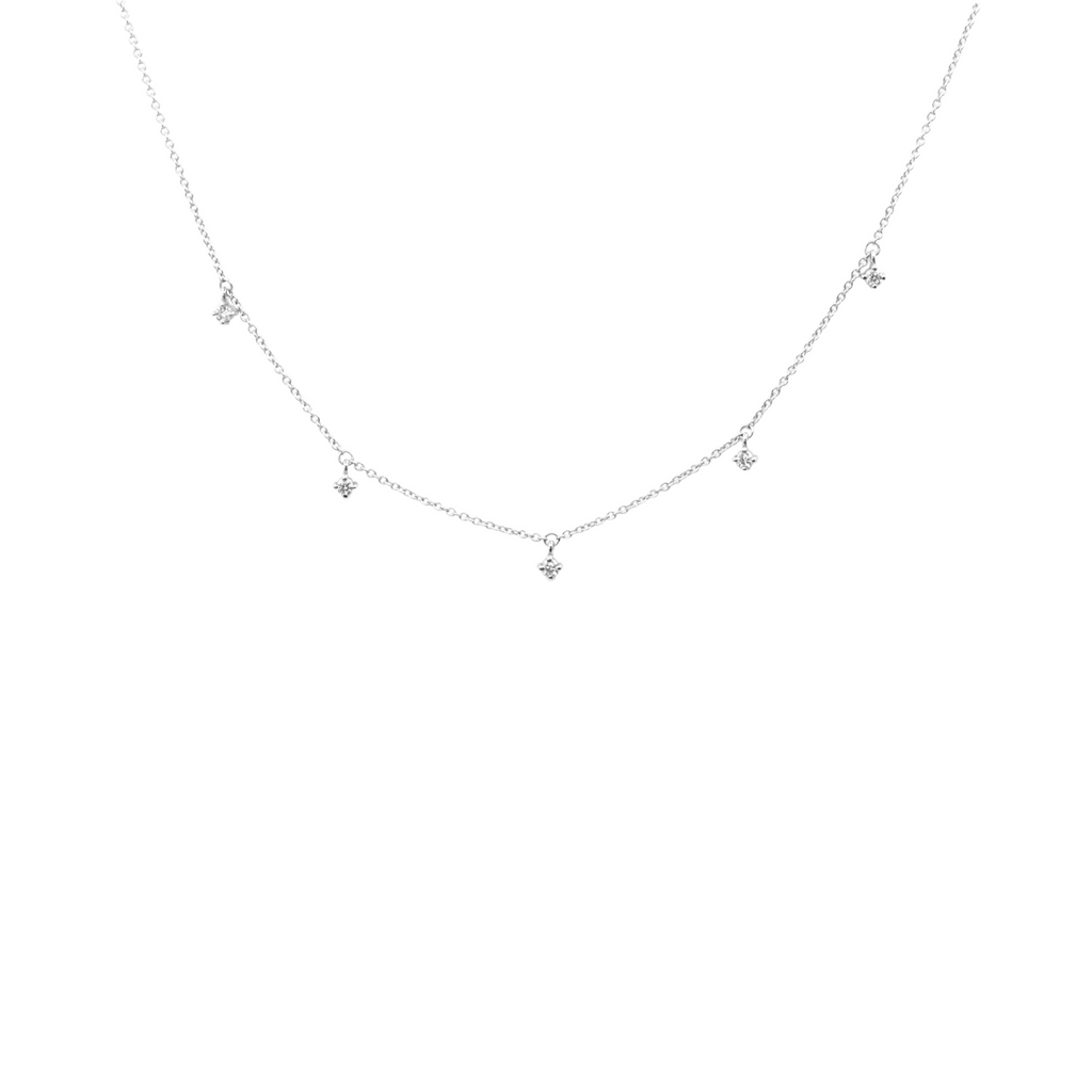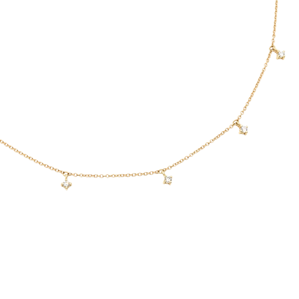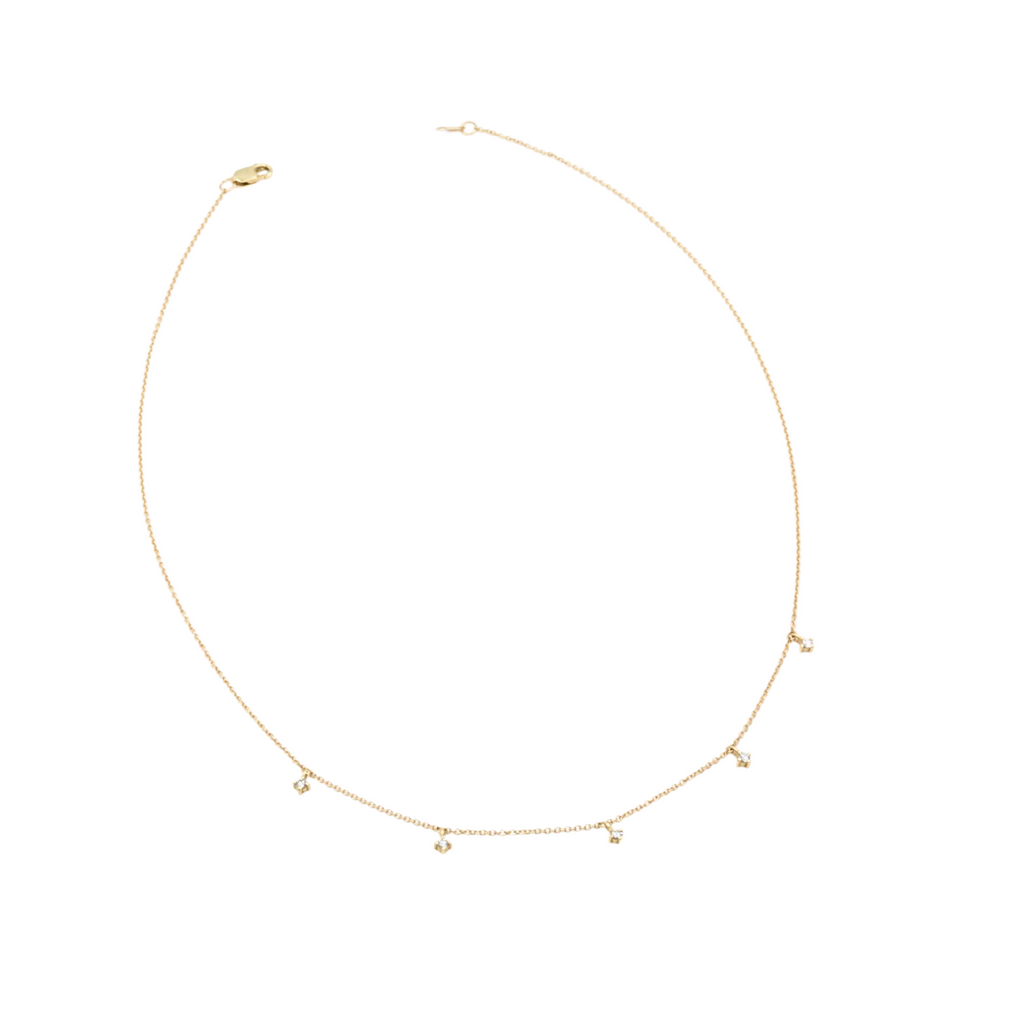 This beautiful necklace features five brilliant diamonds hanging throughout the chain. The design delivers a subtle elegance with the delicate diamonds spaced around the neck. The diamonds are in low-profile four prong compass settings. You will love to wear it on its own & layered with other necklaces.