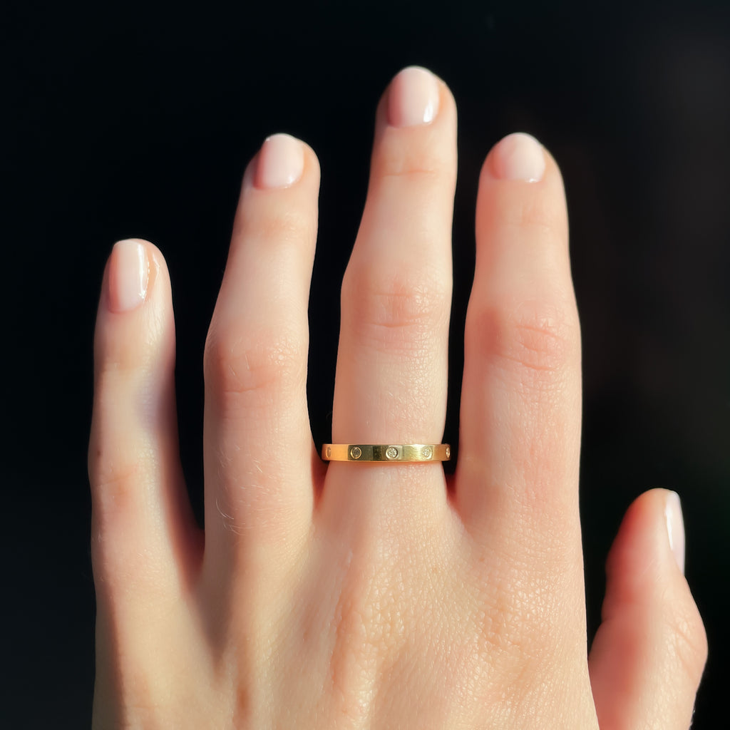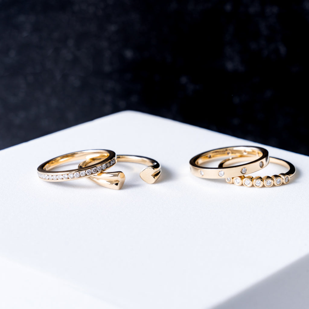 The Randolph Ring is a modern & elegant design. The gold band is embedded with diamonds for a subdued diamond style. It makes a beautiful statement on its own, stacked with other rings, or as a wedding band.