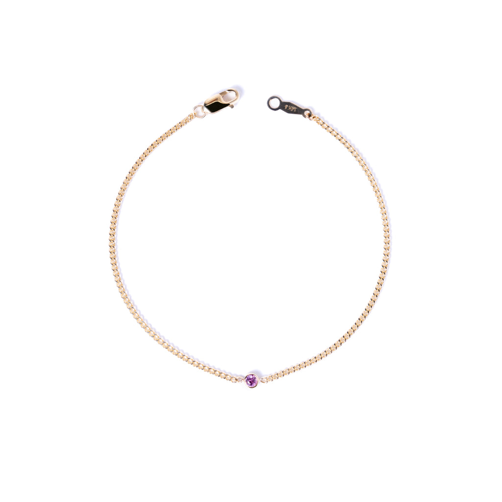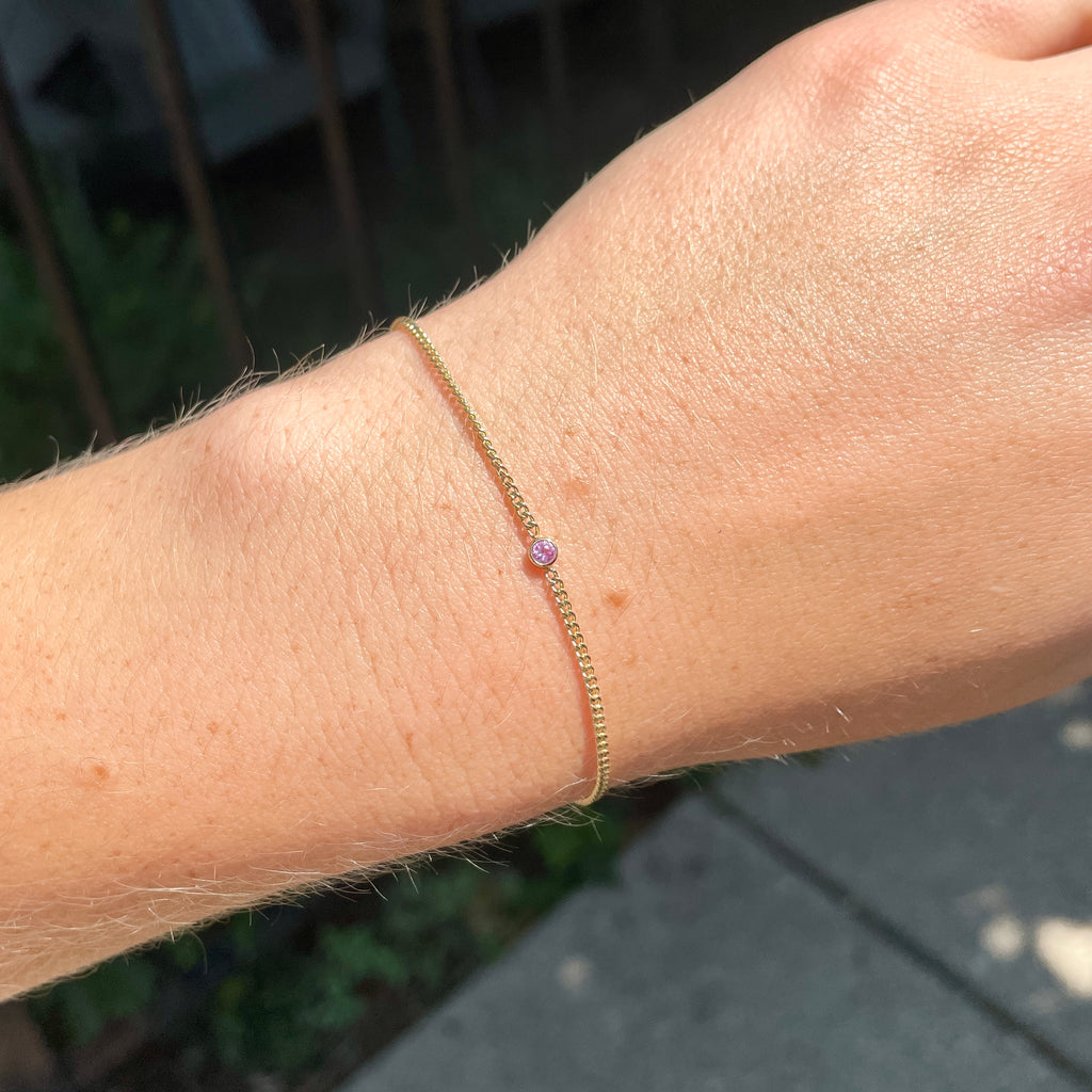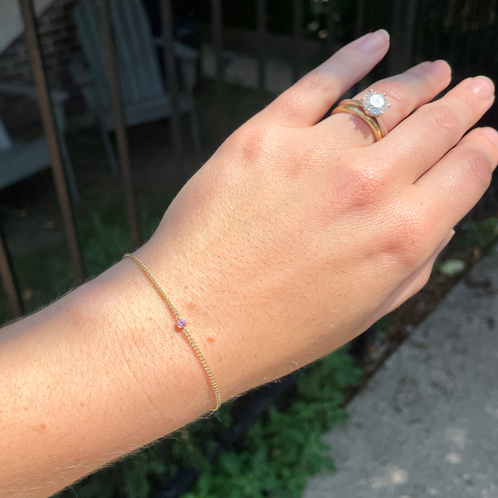 The Sheffield Bracelet is a beautiful & modern design. It has a shining diamond cut curb chain with a lovely pink sapphire in a bezel setting. We know you will put this bracelet on & rarely take it off.