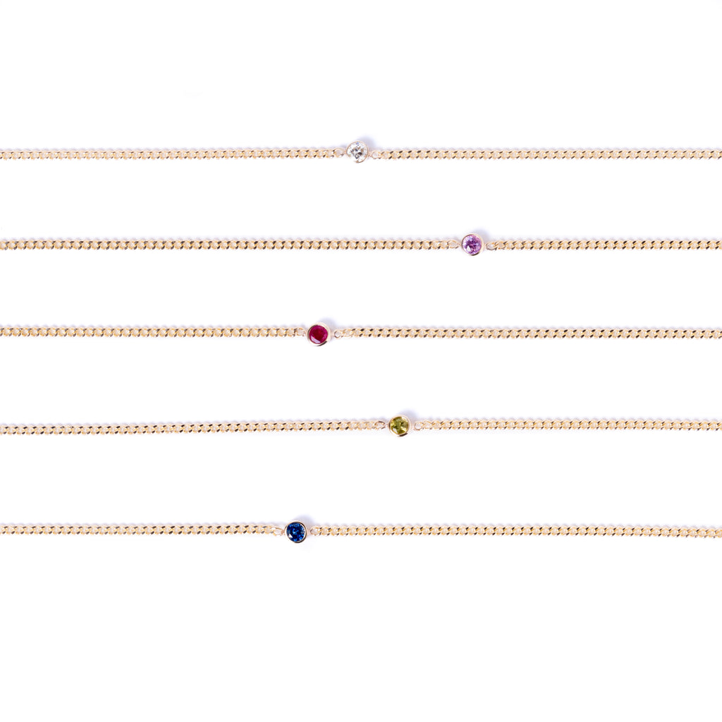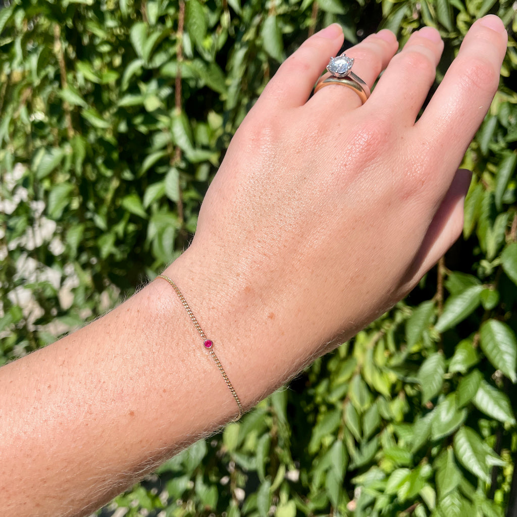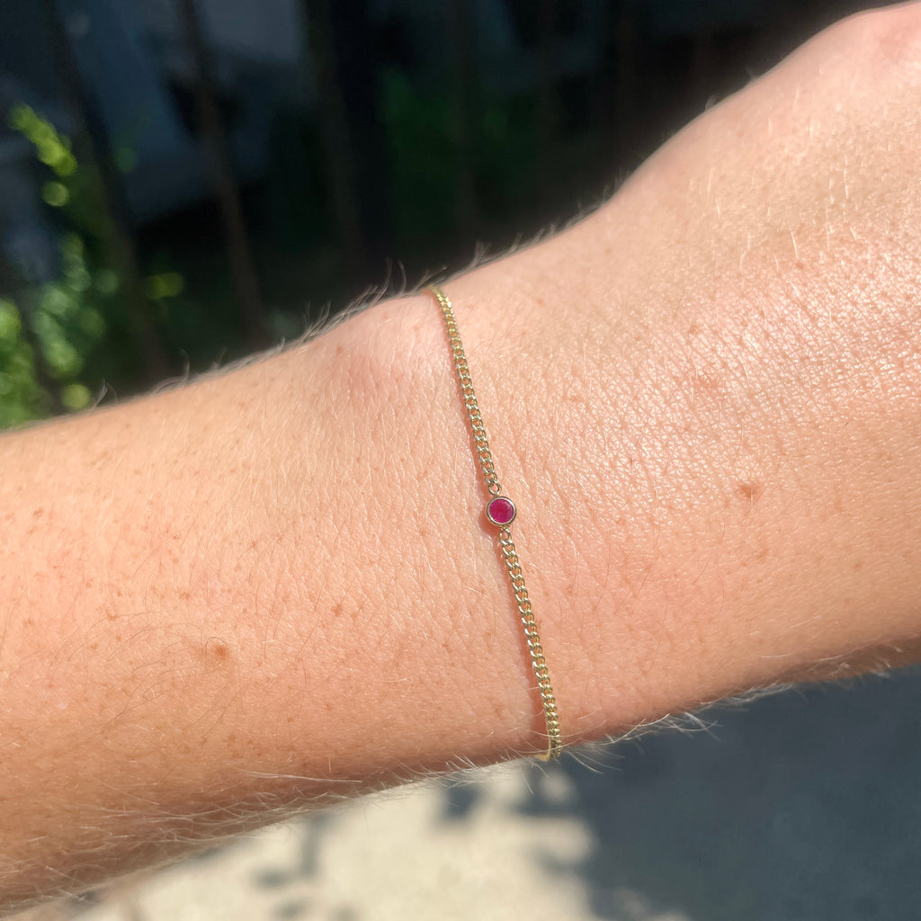 The Sheffield Bracelet is a beautiful & modern design. It has a shining diamond cut curb chain with an elegant ruby in a bezel setting. We know you will put this bracelet on & rarely take it off.