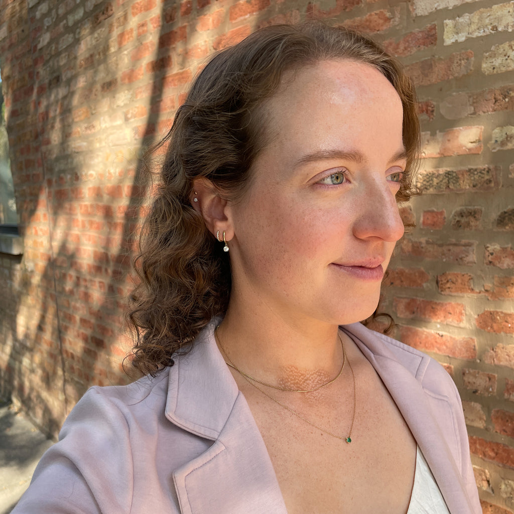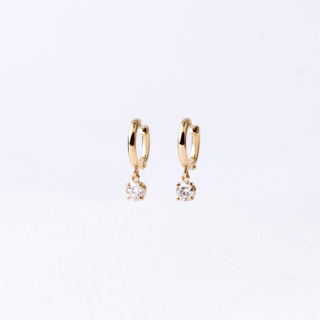 The Sheridan Earrings are a modern take on a classic design. The charms feature brilliant diamonds in 4-prong settings. The charms dangle off the gold domed huggies. These are the earrings you will love and wear forever.