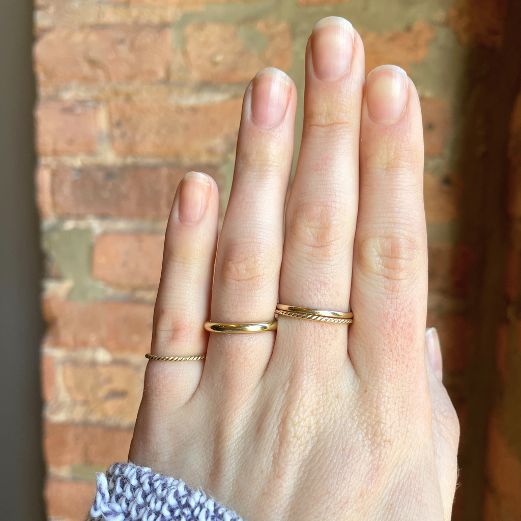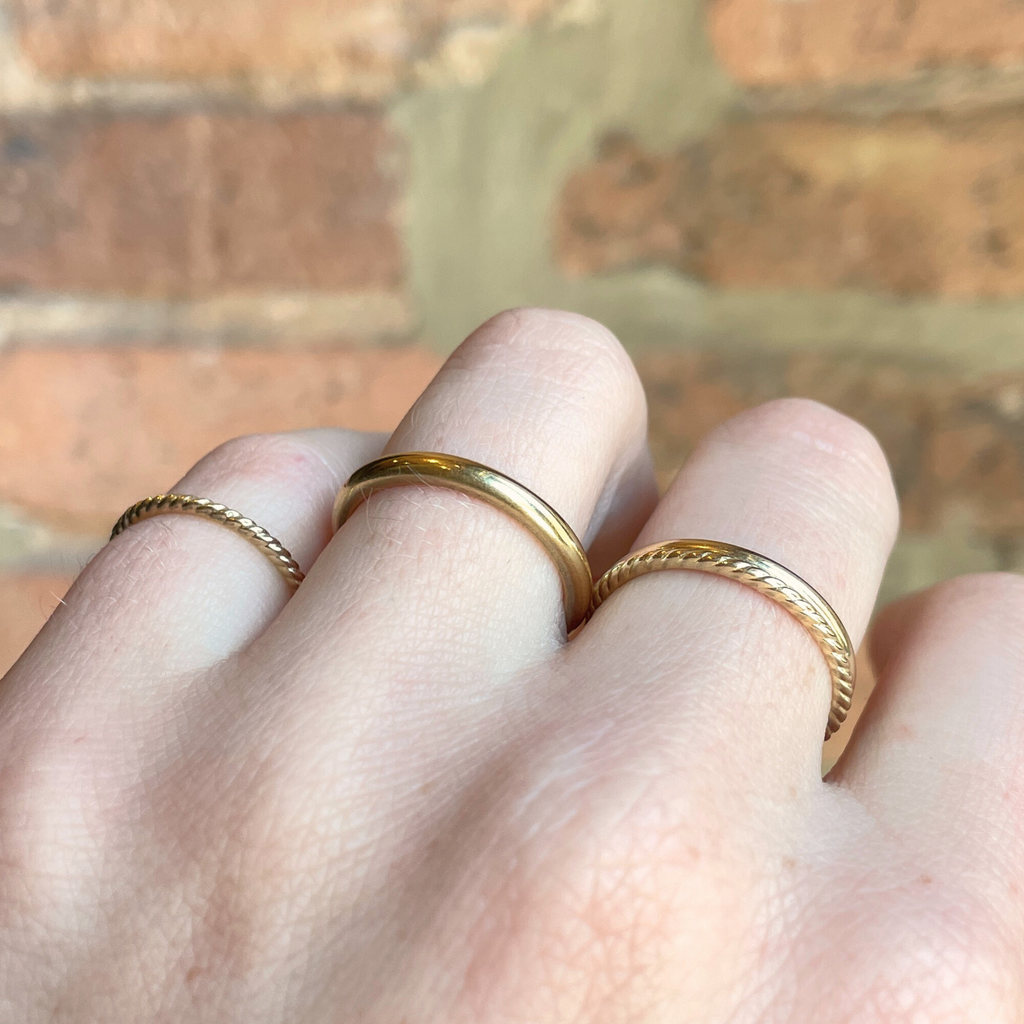 This twisting band design has a delicate texture that creates a beautiful golden shine. We love it styled on its own, stacked with other rings and as a pinky ring.