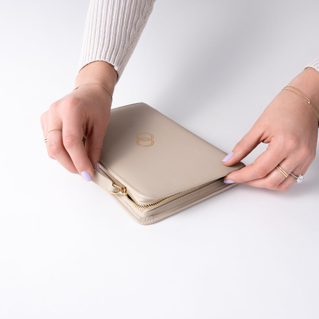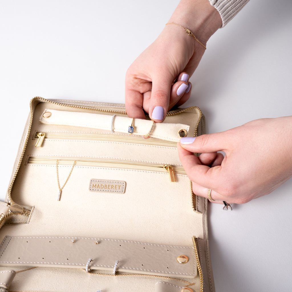 Keep your jewelry safe & organized in Madberet's thoughtfully designed jewelry case. This case is designed with functionality in mind - from the way jewelry is stored inside, to the way it easily stacks with your book, kindle, wallet or laptop inside your bag. Madberet's love for quality extends from jewelry to accessories - this case is constructed with high quality Italian leather and metal hardware to withstand travel & time. This makes a perfect gift for yourself & fellow jewelry lovers.